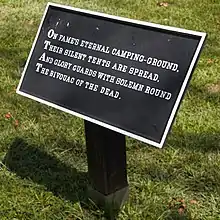 The first monument to the fallen Confederate States of America in Kentucky, the Confederate Monument in Cynthiana, used a verse from "Bivouac of the Dead". Six other monuments in Kentucky also used parts of the poem on memorials to fallen Confederates.[6] Portions of the poem are also displayed on 7 plaques at Finn's Point National Cemetery in Pennsville, New Jersey, where a significant number of Confederate Soldiers who died in captivity during the American Civil War are buried.