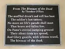 "Bivouac of the Dead" is a poem written by Danville, Kentucky native, Theodore O'Hara to honor his fellow soldiers from Kentucky who died in the Mexican-American War. The poem’s popularity increased after the Civil War, and its verses have been featured on many memorials to fallen Confederate soldiers in the Southern United States, as well as memorials in Arlington National Cemetery, including Arlington's gateway.[1]