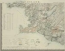 Björn's survey formed the basis of many subsequent maps of Iceland for the next hundred years; new maps based on new surveys appeared only after World War II.[15] It was an immense work, and Björn realized soon enough that one man alone would not be able to triangulate the whole island in his lifetime, and focused his attention on the inhabited areas. Yet he managed to survey a good part of the wilderness, too, even if he had to rely on the accounts of the local population in some remote areas. Björn was well aware of the inaccuracies in some regions; already in 1834 he wrote that one "should neither have too high or too low expectations of the map, nor trust too greatly nor too little in its usefulness or accuracy".[16] The central highlands were sketchy on his map; they were mapped properly for the first time by Þorvaldur Thoroddsen, whose map was printed in 1901. Still Björn's survey is considered a great advancement, especially given the limited resources he had at his disposition.[15] In recognition of his outstanding survey work Björn Gunnlaugsson was awarded the Knight's cross of the Order of the Dannebrog in 1846 and also received the Knight's cross of the French Légion d'honneur.[17] The map was also exhibited at the World's fair at Paris in 1878, where it was awarded a prize.[18]
