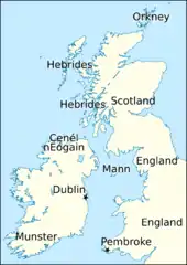 Bjaðmunjo was a daughter of Muirchertach Ua Briain, High King of Ireland.[15] In the late eleventh century, following the death of his father, Muirchertach seized control of the Kingdom of Munster and moved to extend his authority throughout Ireland as High King of Ireland. In so doing, he gained control of the Norse-Gaelic Kingdom of Dublin, and as a result began to extend his influence into the nearby Kingdom of the Isles.[16] There is uncertainty concerning the political situation in the Isles in the last decade of the eleventh century.[17] What is known for sure is that, before the end of the century, Magnús Óláfsson, King of Norway led a marauding fleet from Scandinavia into the Irish Sea region, where he held power until his death in 1103.[18]