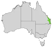 The black-breasted buttonquail is found from Hervey Bay in central Queensland south to the northeastern corner of New South Wales,[17] generally in areas receiving 770–1,200 mm (30–47 in) rainfall annually.[9] There had been only ten reports from New South Wales in the decade leading up to 2009.[18] Fieldwork across the Wide Bay–Burnett region from 2016 to 2018 found it in scattered locations in its suitable habitat from Teewah Beach to Inskip Point on the mainland and along the east coast of near K'Gari.[19] It is found in Palmgrove National Park, which has been identified by BirdLife International as an Important Bird Area for the species.[20] The black-breasted buttonquail was once populous on Inskip Point, with the area a destination for birdwatchers wanting to see this species. Mike West, former president of Birds Queensland, blamed dingoes and wild dogs for wiping out the population.[21]