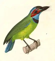 Bucco duvaucelii was the scientific name proposed by René Lesson in 1830 who described a barbet from Sumatra.[2] The generic name Psilopogon was proposed by Salomon Müller in 1836, initially for a fire-tufted barbet (P. pyrolophus) from Sumatra.[4] In subsequent decades, about 19 generic names were proposed for barbet species, including Megalaima by John Edward Gray in 1849 and Mezobucco by George Ernest Shelley in 1889. Taxonomists used different generic names when describing barbets in collections of natural history museums.[5]