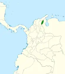 The black-fronted brushfinch is found only in the Serranía de Perijá, which straddles the border of northern Colombia and western Venezuela. It inhabits humid montane forest at elevations between 1,100 and 2,850 m (3,610 and 9,350 ft). It prefers shrubby edges and second growth forest and appears to tolerate disturbed habitats.[3]