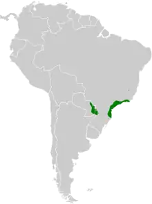 Though it was formerly more widespread, the black-fronted piping guan is now found spottily in two general areas. It ranges near the Brazilian coast roughly from Paraná state north to Rio de Janeiro and also in Argentina's far northeastern Misiones Province and adjacent eastern Paraguay. It is the only piping guan in this range though formerly it overlapped a small amount with blue-throated piping guan (P. cumanensis) in Paraguay. It inhabits several types of Atlantic Forest including evergreen, gallery, and coastal. It is almost always found in mature primary forest though also in older secondary forest and restinga. In elevation it formerly ranged from sea level as high as 1,850 m (6,070 ft) but now is usually found only below 1,000 m (3,300 ft)[4]