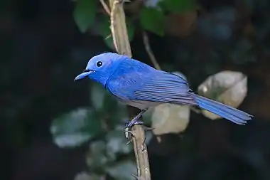 The black-naped monarch was described by the French polymath Georges-Louis Leclerc, Comte de Buffon in 1779 in his Histoire Naturelle des Oiseaux.[2] The bird was also illustrated in a hand-coloured plate engraved by François-Nicolas Martinet in the Planches Enluminées D'Histoire Naturelle which was produced under the supervision of Edme-Louis Daubenton to accompany Buffon's text.[3] Neither the plate caption nor Buffon's description included a scientific name but in 1783 the Dutch naturalist Pieter Boddaert coined the binomial name Muscicapa azurea in his catalogue of the Planches Enluminées.[4] Buffon specified that his specimen had been collected in the Philippines, but in 1939 the American ornithologist James L. Peters restricted the type locality to Manila on the island of Luzon.[5][6] The black-naped monarch is now placed in the genus Hypothymis was introduced by the German zoologist Friedrich Boie in 1826 with the black-naped monarch as the type species.[7][8] The genus name is from the Ancient Greek hupothumis, the name of an unidentified bird mentioned by the playwright Aristophanes. The specific epithet azurea is from the Medieval Latin azureus meaning "azure-coloured" or "azure-blue".[9]