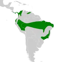 The species has a patchy distribution in tropical Central and South America. It is present in Costa Rica, Panama, Colombia, Venezuela, Ecuador, Peru (on both sides of the Andes) and large parts of Brazil.[1] Where their ranges overlap, it is generally found in drier habitats than the whiskered myiobius (M. barbatus), and at higher elevations.[5] It generally frequents forest verges and secondary growth, often near water, whereas the whiskered myiobius prefers the interior of forests.[4]