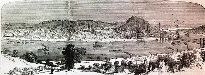 Race relations in Cincinnati at the time were incredibly volatile.[2] While the city had more than its share of exceptional abolition leaders [3] before the American Civil War, the attitude of Cincinnatians in general towards abolitionism was one of open hostility. Most of the citizens discountenanced the institution of slavery but were willing to wink at its continuance in the South for financial reasons.[4] The intensity of sentiments has risen up to destruction of property, killings, and mob violence against blacks since about the 1830s. Peter H. Clark states, "Nowhere has the prejudice against colored people been more cruelly manifested than here."[5] Cincinnati, which lies along the Ohio River in southern Ohio, bordered the Union-held slave state of Kentucky. People from Ohio were "aggressively barring" blacks from migrating to the state.[6] State laws, called the Black Laws of 1804 and 1807, required that blacks provided proof that they were free and posted $500 guaranteeing good behavior.[6] Blacks did not have the right to vote. They could not testify against white people in trials, whether by law before 1849 or mob rule after the law preventing their testimony was overturned.[6]