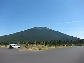 According to the U.S. National Geodetic Survey and scientists from the United States Geological Survey, Black Butte has an elevation of 6,436 feet (1,962 m);[1][7] the Geographic Names Information System database lists its elevation as 6,430 feet (1,960 m),[3] while Oregon Geographic Names lists its elevation at 6,415 feet (1,955 m).[8][a] The butte has proximal and draping reliefs of 2,490 feet (760 m) and 3,150 feet (960 m), which are the "difference between summit elevation and that of highest exposure of older rocks overlain by the edifice" and the "difference between summit elevation and that of lowest distal lavas of the edifice (not including distal pyroclastic or debris flows)," respectively.[7] According to E. M. Taylor, Black Butte has a diameter of 4 miles (6.4 km).[9]