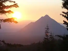 Black Butte (formerly Wintoon Butte, Cone Mountain, Sugar Loaf and Muir's Peak) is a cluster of overlapping dacite lava domes in a butte,[2] a satellite cone of Mount Shasta.[5] It is located directly adjacent to the northbound lanes of Interstate 5 at milepost 742 between the cities of Mount Shasta and Weed, California. The I-5 freeway crosses a 3,912 ft (1,192 m) pass, Black Butte Summit, at the western base of the lava domes. The lava domes were extruded at the foot of the cone of Shastina following the period of its major eruptions about 9,000–10,000 years ago.[2]