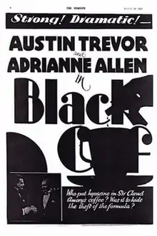 The play was adapted into a motion picture, also entitled Black Coffee, in 1931, with Austin Trevor in the role of Poirot. Running to 78 minutes, the motion picture was produced by Julius S. Hagan and released on 19 August 1931 by Twickenham Film Studios. This was one of three appearances that Trevor made as Poirot, having also appeared in Alibi (1931) and Lord Edgware Dies (1934). It is now considered a lost film.[13][14]