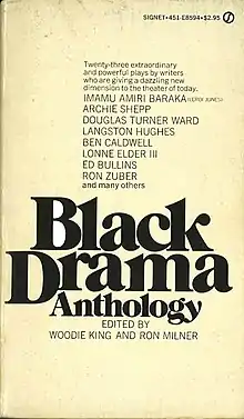 Black Drama Anthology is a 1971 collection of plays solely written by Black American playwrights. The anthology was edited by Woodie King Jr, a Black American stage producer and Ron Milner, a Black American playwright. Writer Langston Hughes, Jazz musician Archie Shepp and writer Imamu Amiri Baraka appear in this collection, among others. Black Drama Anthology opens with a foreword by the editors King and Milner which outlines the motivations behind this collection, in which they write, "...recognizing all of this, and understanding that if we blacks are to have a theater in our own image, according to our own views, then we blacks will have to say which plays are in those images and of those views, we have here compiled an anthology of works by twenty-two of the best black playwrights...Twenty-three selections from an immensely rich field of talented black artists forging new, unique, and viable theater."[1]
