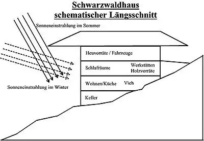 Depending on the site of the individual farms various types of Black Forest house have emerged which are designed to cope with the specific climatic situation. Hermann Schilli, the initiator of the open-air museum of Vogtsbauernhof distinguishes seven types of Black Forest house:[4]