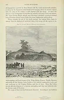 Comparable to the barrows of Gnyozdovo near Smolensk, the Black Grave has a height of over 10 metres and a circumference of 170 metres.[1] During excavations undertaken in 1872–73, Dmitry Samokvasov uncovered two cremated bodies of Norse warriors (probably father and son), surrounded by slaves, sacrificial animals, arms, armour, and decorations. Samokvasov dated the burial to the late 10th century, when Vladimir I was the ruler of Kievan Rus. It is likely that the buried warriors were two princes (knyazes) of Chernihiv, although no local potentate is attested in the Slavonic chronicles before Vladimir's son, Mstislav of Chernihiv.