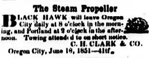 On May 29, 1851, Blackhawk, under Capt. Charles Clark, was making a regular daily run between Oregon City and Portland, departing Oregon City in the morning, and returning the same day from Portland.[7][8][9]
