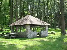 Eighteen structures in the Beach and Day Use Historic District are protected as contributing properties, including seven "standard" pavilions, a larger picnic shelter, and three water pump shelters. These last were built of native stone and covered with pebbles, and have since been converted to small picnic pavilions. The concession building, beach bathhouse, and museum are also protected.[18] Four open pit latrines with wane edge siding and hipped roofs were also contributing structures to the Beach and Day Use district.[18]