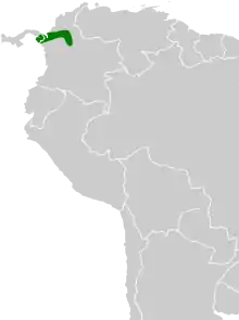 The black oropendola is endemic to humid forests of northwestern South America. Its range includes northwestern Colombia, as far east as the Magdalena River, and the extreme southeastern part of Panama, a total area of occupancy of about 108,000 km2 (41,700 sq mi). Its altitudinal range is up to about 800 m (2,620 ft).[1][2]