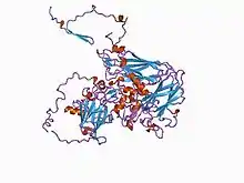 The black queen cell virus contains 60 copies of the capsid proteins VP1, VP2, and VP3.[2] The capsid is the shell of the virus that holds the virus's genetic material. VP4 proteins, which are sometimes also found in the capsid, do not affect the virus's infectivity,[2] or ability to be transmitted. The surface of the virion has large protrusions, which are formed by the VP1 and VP3 proteins and are located between the 5- and 3-fold axes of the icosahedral capsid.[2] An icosahedral capsid is formed from 20 triangular faces, put together in such a way that it resembles a sphere.[11] The axes are found where the faces come together.