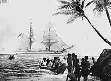 The violence and death surrounding the Queensland blackbirding trade intensified in the early 1880s. Local communities in the New Hebrides and the Solomon Islands had increased access to modern firearms which made their resistance to the blackbirders more robust. Well known vessels that experienced mortality amongst their crews while attempting to recruit Islanders included Esperanza at Simbo, Pearl at Rendova Island, May Queen at Ambae Island, Stormbird at Tanna, Janet Stewart at Malaita and Isabella at Espiritu Santo amongst others.[59][60] Officers of Royal Navy warships attempting punitive action were not exempt as targets with Lieutenant Bower and five crew of HMS Sandfly being killed in the Nggela Islands[61] and Lieutenant Luckcraft of HMS Cormorant being shot dead at Espiritu Santo.[62] Numerous punitive expeditions were carried out by Royal Navy warships based at the Australia Station. HMS Emerald under Captain W.H. Maxwell went on an extensive punitive expedition, shelling and destroying numerous villages,[63] while marines of HMS Cormorant executed various Islanders suspected of killing white men.[64] Captain Dawson of HMS Miranda led a mission to Ambae Island, killing a chief suspected of murdering blackbirders,[65] while HMS Diamond went on a "savage-hunting expedition" throughout the Solomon Islands which resulted in no casualties on either side.[66] At Ambrym, the marines of HMS Dart under Commander Moore, raided and burned down a village in retaliation for the killing of Captain Belbin of the blackbirding ship Borough Belle.[67] Likewise, HMS Undine patrolled the islands, protecting the crews of blackbirding vessels such as Ceara from mutinies of the labour recruits.[68]