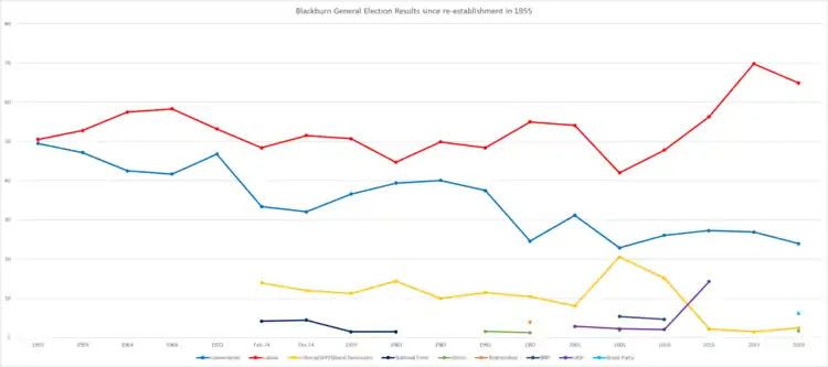 Blackburn was re-established as a single-member constituency for the 1955 general election, partially replacing Blackburn East and Blackburn West. After its re-establishment, the constituency was initially a marginal, but Blackburn is now considered to be a Labour Party stronghold.