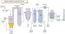 In 1992, the problem of ammonia levels in the final effluent was addressed by the construction of a system using anoxic zones and diffuse air activated sludge treatment. This dramatically reduced ammonia levels, and was the most significant factor in the re-establishment of fish stocks in the lower River Don.[9] In 1990, the outdated filter presshouse and incineration plant were replaced by a new sludge-dewatering plant and a fluidized-bed incinerator.[16] The new plant made the old sludge beds, situated to the east of the River Don and on the island formed by the Don and the Holmes Cut, redundant, and these have now become a nature reserve. Further improvements to the process were completed by 2005. These included an upgrade to the wet scrubbing system, in order to remove heavy metals and acid gases such as sulphur dioxide, hydrogen chloride and hydrogen fluoride from the flue gases produced by the incinerator, and the addition of a tertiary adsorption filter, which removes mercury and dioxins. The improvements were designed to ensure that the plant met the standards set out in the Waste Incineration Directive.[17]