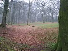 The camp has a single 5 metres (16 ft) wide entrance on the south side.[4] Originally, the entrance had a gateway with wooden gates, possibly within a wooden gate-tower.[4] The entrance was gravelled using pebbles from a nearby stream suggesting heavy usage was expected in the wetter seasons.[4] The three other entrances are believed to have been built more recently than the Iron Age.[6] In front of the entrance is a triangular earthwork, or barbican, flanked by a bank and ditch.[4] It is not known whether this earthwork was a defensive structure or had a practical use such as holding cattle.[4]
