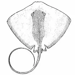 The tail is much longer than the disc and bears a serrated stinging spine on top, about one disc length back from the base. The base of the tail is flattened, tapering to become whip-like past the sting; there are no fin folds. The dorsal surface of the disc is densely covered by granules that become smaller towards the disc margin, starting in front of the disc and reaching the base of the tail. Large thorns with star-shaped bases are found in a row along the midline of the back, as well as scattered over the rest of the disc; these thorns resemble small limpets or salt crystals, hence the ray's Tamil name uppan thirukai ("salt-like ray").[3] The tail is smooth up to the spine, and beyond is entirely covered by small granules and prickles. The center of the disc is dark brown or gray above, becoming darker or light violet towards the margins, and sometimes with a posterior yellow area reaching the base of the sting. There may be small yellowish spots scattered over the disc, or a bluish irregular line running around the disc a small distance from the edge. The underside is white with a wide, black, irregularly edged band running along the lateral and posterior disc margins. The tail is brown at the base and white past the sting.[3][5] This large species grows to 1.8 m (5.9 ft) across and 3.5 m (11 ft) long.[1]