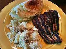 Blackening is a cooking technique used in the preparation of fish and other foods. Often associated with Cajun cuisine, this technique was popularized by chef Paul Prudhomme.[1] The food is dipped in melted butter and then sprinkled with a mixture of herbs and spices, usually some combination of thyme, oregano, chili pepper, peppercorns, salt, garlic powder and onion powder.[2] It is then cooked in a very hot cast-iron skillet.[2][3] The characteristic brown-black color of the crust results from a combination of browned milk solids from the butter and charred spices.[4]