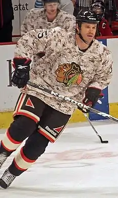 Prior to the 2008–09 season opener, the Blackhawks named 20-year-old Toews as the new captain, succeeding Adrian Aucoin (who was traded to the Calgary Flames, after the 2006–07 season) and making him the third youngest captain at the time of appointment. In addition to a new captain, the Blackhawks made several major roster changes before the season, trading Tuomo Ruutu, their longest tenured player, to the Carolina Hurricanes in exchange for forward Andrew Ladd on February 26, 2008.[27] Later that day, the Blackhawks traded captain Martin Lapointe to the Ottawa Senators in exchange for a sixth-round draft pick in the 2008 NHL Entry Draft.[27] On July 1, the first day of free agency, the team signed goaltender Cristobal Huet to a four-year, US$22.5 million contract, and later signed defenseman Brian Campbell to an eight-year, $56.8 million contract.[28] They also added former coaches Joel Quenneville and Scotty Bowman to their organization.[29][30][31]