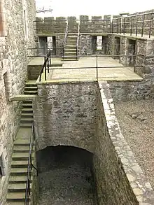 Between 1534 and 1540, a programme of fortification was carried out under the direction of the King's Master of Works, Sir James Hamilton of Finnart.[9] Finnart, the illegitimate son of the Earl of Arran, was an expert in artillery fortification. Having spent time in Europe studying the subject, he designed his own castle at Craignethan in Lanarkshire as a showcase for his ideas.[10] At Blackness, he introduced technological innovations including a complex entrance with a caponier, one of only three surviving in Scotland (the others being at Craignethan and Stirling Castle). The caponier, a passage within the external wall of the entrance, allowed defenders to fire into the entrance area, at the backs of any attackers who had breached the gate. The curtain wall was thickened on the inside to the south and east, from 1.5 m (5 ft) to over 5 m (16 ft) in places, and gun ports were opened up. The south wall was also heightened to enclose the new south tower.[11]