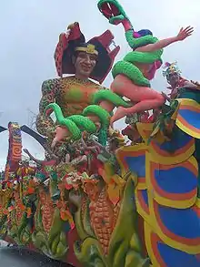 - Floats: Up to 50 x 65 feet long, taken up by trucks or trailers, where troupes made up of tourists who pay the right of way for participating in them, carry a costume that identifies each carriage. These massive structures are characterized by large rolling allegorical figures or caricatures with articulated movement (forward deployed by the Master Alfonso Zambrano), by design, finishing and complexity can become true works of art. This part of the parade is led by carnival queen in her own float (out of competition).