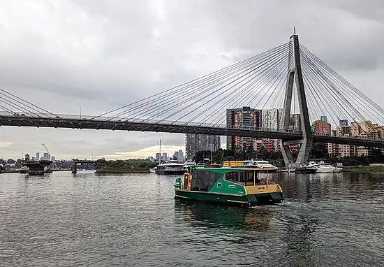 The Sydney ferry Me-Mel about to go under the ANZAC Bridge then through the old Glebe Island Bridge, which is always open, on the F10 service from Blackwattle Bay to Barangaroo