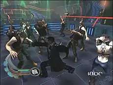 Combat is controlled via the right analog stick, allowing for what the developers call a "360° combat system" – the player moves the stick in the direction in which they want to attack and Blade punches or kicks in that direction.[3] The player has no control over what kind of attack Blade executes, only the direction in which he attacks.[1] Blade can also block, chain attacks together into combos and perform "finishing moves", such as grabbing an enemy in a headlock and driving a stake into their head.