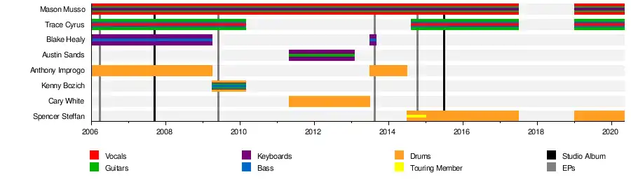 In 2005, Mason Musso and Trace Cyrus agreed to meet on the set of Hannah Montana, which starred Mason's brother, Mitchel, and Trace's sister, Miley. Sharing musical interests, they decided to form a band.[5] Shortly thereafter, Cyrus recruited Blake Healy from Synthetic Joy[9] and the Bum Out Eternal[5] as a keyboardist, synthesist, and bassist. Cyrus remained the singer and the lead guitarist. Musso became the group's main singer and rhythm guitarist.