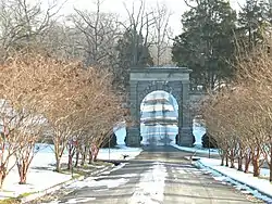 Over the entrance road is a stone arch labeled "Our Confederate Heroes" with the dates 1861–1865 and 1866–1913.