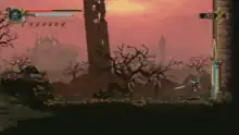 The update also features a crossover with another indie Metroidvania, Bloodstained: Ritual of the Night, where the main character Miriam needs the help of the Penitent One to complete the Challenge Rooms in order for her to return to her world.[11] The developers also added a new Demake Area that features an 8-bit style to the game that makes it feel more like a classic platformer from the NES era of games.[12]