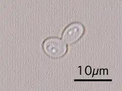 A blastoconidium (plural blastoconidia) is an asexual holoblastic conidia formed through the blowing out or budding process of a yeast cell, which is a type of asexual reproduction that results in a bud arising from a parent cell.[1][2] The production of a blastoconidium can occur along a true hyphae, pseudohyphae, or a singular yeast cell.[3] The word "conidia" comes from the Greek word konis and eidos, konis meaning dust and eidos meaning like. The term "bud" comes from the Greek word blastos, which means bud. [4] Yeasts such as Candida albicans and Cryptococcus neoformans produce these budded cells known as blastoconidia.[5][6]