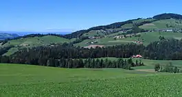 Before the merger, Bleiken bei Oberdiessbach had a total area of 3.4 km2 (1.3 sq mi).[3] Of this area, 1.98 km2 (0.76 sq mi) or 57.9% is used for agricultural purposes, while 1.28 km2 (0.49 sq mi) or 37.4% is forested. Of the rest of the land, 0.14 km2 (35 acres) or 4.1% is settled (buildings or roads) and 0.01 km2 (2.5 acres) or 0.3% is unproductive land.[4]