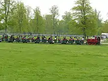 The facilities at The Pleasure Gardens include a maze, a plant centre, a cafeteria, the popular butterfly house, and the main car park for visitors. The railway was adapted to provide an actual transport facility between the Pleasure Gardens and Blenheim Palace itself, and during the tourist season trains run in each direction every half-hour.[3] The line is now an end-to-end operation laid out roughly in the shape of a figure '7', and extending over a distance of 1,000 yards (910 m). There are run-round loops at each terminal station, and there was a central passing loop allowing the operation of two trains. This loop has now had one set of points removed, thus changing it into a siding. The line also has a three-road engine and stock storage shed.