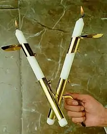 In Germany and in other places, the blessing of throats is given with lighted candles.[2][3] It is frequently also given on the evening of Candlemas (the previous day), sometimes even on the proximate Sunday, when more people attend Mass than on St. Blaise's proper feast day.