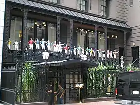 Speakeasies did not need to be big to operate. "It didn't take much more than a bottle and two chairs to make a speakeasy."[27] One example for a speakeasy location was the "21" Club in New York. This is one of the more famous of the speakeasies and operated until 2020. The "21" Club was only part of a series of businesses owned by Charlie Berns and Jack Kriendler. They started the business in Greenwich with a place called "The Redhead" and later moved onto the next operation "The Puncheon Club". The "21" Club was special because of its system to remain under the radar. It was a unique system that used a doorkeeper to send a warning to the bar that it was in danger and the bar would transform into an ordinary place through a mechanism.[28]