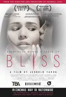 Bliss is a 2017 Filipino psychological thriller film written, directed, edited and scored by Jerrold Tarog.[4] It stars Iza Calzado, Ian Veneracion, TJ Trinidad, Michael de Mesa, and Adrienne Vergara.[3] The film competed in Japan at the 12th Osaka Asian Film Festival in March 2017 to critical acclaim,[4][5] where Calzado also garnered the Yakushi Pearl Award for Best Performer.[6] The film premiered in the Philippines on May 10.[5]