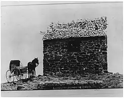 The stone structure was constructed on the summit of Wichita Mountain's Signal Mountain encompassing a terrestrial elevation of 1,750 feet (530 m).[5] The shelter has a dimension of 14 feet (4.3 m) by 16 feet (4.9 m) with a structural exterior consisting of native stone collected within the vicinity of the Wichita Mountains. The four wall dwelling was erected as some of the first limestone architecture as part of Fort Sill's Old Post Corral or United States Army Quartermaster Corps fortification foraged during the American Indian Wars on the American frontier.[6]