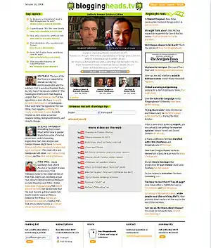 Bloggingheads.tv (sometimes abbreviated "bhtv") is a political, world events, philosophy, and science video blog discussion site in which the participants take part in an active back and forth conversation via webcam which is then broadcast online to viewers. The site was started by the journalist and author Robert Wright and the blogger and journalist Mickey Kaus on November 1, 2005.[1] Kaus has since dropped out of operational duties of the site as he didn't want his frequent linking to be seen as a conflict of interest.[2] Most of the earlier discussions posted to the site involved one or both of those individuals, but since has grown to include a total of over one thousand individual contributors, mostly journalists, academics, scientists, authors, well known political bloggers, and other notable individuals.