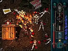 Central influences included vampire mythology, William Shakespeare's plays, themes of ethical dilemma in the film Unforgiven, the visceral qualities of the Necroscope novels, and the intricate plot of The Wheel of Time book series.[3][17] Although antiheroes were previously uncommon in action-adventure games, Silicon Knights rejected concerns that the character of Kain was too unconventional and the story too ambitious.[45] The developers endorsed the narrative motif, "what is evil? Perhaps it is merely a perspective", and hoped to determine how players would react in "a world where [they] had to kill innocents to survive".[3][17][46] McCulloch, who wrote the majority of in-game texts, was urged by marketer colleagues to give characters more accessible names—he described some, such as Mortanius, as "Names from Hell", which were difficult to get past the "marketing censor".[47] Cover art for the historical novel The Pillars of the Earth served as the inspiration behind the Pillars of Nosgoth.[3] The Soul Reaver sword, which was originally conceived as a weapon for Too Human, was transferred to Blood Omen's fictional universe, and would become a mainstay weapon in subsequent games in the Legacy of Kain series.[41][48]