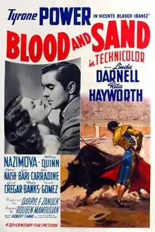 Blood and Sand is a 1941 American romantic Technicolor film starring Tyrone Power, Linda Darnell, Rita Hayworth, and Nazimova. Directed by Rouben Mamoulian, it was produced by 20th Century Fox and was based on the 1908 Spanish novel, which was critical of bullfighting, Blood and Sand (Sangre y arena), by Vicente Blasco Ibanez.[2] The supporting cast features Anthony Quinn, Lynn Bari, Laird Cregar, J. Carrol Naish, John Carradine and George Reeves. Rita Hayworth's singing voice was dubbed by Gracilla Pirraga.