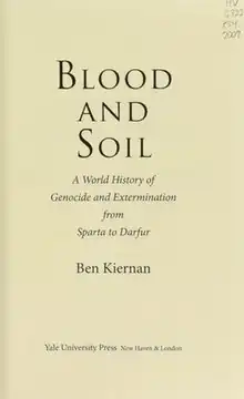 Blood and Soil: A World History of Genocide and Extermination from Sparta to Darfur (ISBN 978-0300100983) is a 2007 book by Ben Kiernan, who for thirty years has studied genocide and crimes against humanity. In Blood and Soil, Kiernan examines outbreaks of mass violence, including worldwide colonial exterminations and twentieth-century case studies, particularly the Armenian genocide, the Nazi Holocaust, Stalin's mass murders, and the Cambodian and Rwandan genocides. The book won the 2008 gold medal for the best book in History awarded by the Independent Publishers Association.[1][2][3] In 2009, Blood and Soil won the German Studies Association's biennial Sybil Halpern Milton Memorial Book Prize[4] for the best book published in 2007 or 2008 dealing with Nazi Germany and the Holocaust in its broadest context, covering the fields of history, political science, and other social sciences, literature, art, and photography. In June 2009, the book's German translation, Erde und Blut: Völkermord und Vernichtung von der Antike bis heute, won first place in Germany's Nonfiction Book of the Month Prize (Die Sachbücher des Monats).[5]