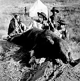 On August 7, 1874, Bloody Knife encountered a grizzly bear roughly seventy-five yards from where Custer was searching for a campsite. Custer, having had a lifelong dream of killing a grizzly bear,[11] shot the bear twice with his Remington rifle, hitting it in the thigh, and Bloody Knife and William Ludlow helped with the kill. The bear was an old male with broken teeth, covered in scars,[12] and weighed 800 pounds (360 kg).[11] Though Custer took credit for the kill, some believe that the fatal bullet was fired by Bloody Knife,[13] and 2002 biography The Custer Companion states that the coup de grâce was a cut to the jugular vein by Bloody Knife.[1]