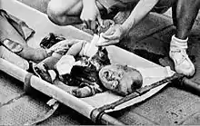Wong sent the newsreel footage on a U.S. Navy ship to Manila and from there, the film was flown to New York City aboard a Pan American World Airways airliner.[12] Beginning in mid-September 1937, the newsreel was shown to movie theater audiences, estimated a month later to number 50 million people in the U.S. and 30 million outside of the U.S.[11] and the still image of the crying baby was printed in Hearst Corporation newspapers and affiliates, some 25 million copies.[12] A further 1.75 million non-Hearst newspaper copies showed the image in the U.S., and 4 million more people saw it as a matte reproduction in other newspapers.[11] Some 25 million people saw it internationally.[11] It first appeared in Life magazine on October 4, 1937, at which point it was estimated that 136 million people had seen it.[11][12] On the facing page in Life magazine, another photograph showed the baby on a stretcher receiving medical care.[11]