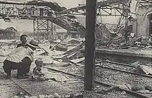 Bloody Saturday (Chinese: 血腥的星期六; pinyin: Xuèxīng de Xīngqíliù) is a black-and-white photograph taken on 28 August 1937, a few minutes after a Japanese air attack struck civilians during the Battle of Shanghai in the Second Sino-Japanese War. Depicting a Chinese baby crying within the bombed-out ruins of Shanghai South railway station, the photograph became known as a cultural icon demonstrating Japanese wartime atrocities in China. The photograph was widely published, and in less than a month had been seen by more than 136 million viewers.[1] The photographer, Hearst Corporation's H. S. "Newsreel" Wong, also known as Wong Hai-Sheng or Wang Xiaoting, did not discover the identity or even the sex of the injured child, whose mother lay dead nearby. The baby was called Ping Mei.[2] One of the most memorable war photographs ever published, and perhaps the most famous newsreel scene of the 1930s,[3] the image stimulated an outpouring of Western anger against Japanese violence in China.[4] Journalist Harold Isaacs called the iconic image "one of the most successful 'propaganda' pieces of all time".[5]