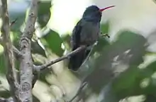 The blue-throated goldentail (Chlorestes eliciae), also known as the blue-throated sapphire, is a species of hummingbird in the family Trochilidae. It is found in Belize, Colombia, Costa Rica, El Salvador, Guatemala, Honduras, Mexico, Nicaragua, and Panama.[3] Its natural habitats are subtropical or tropical moist lowland forest and heavily degraded former forest.[4][5][6]